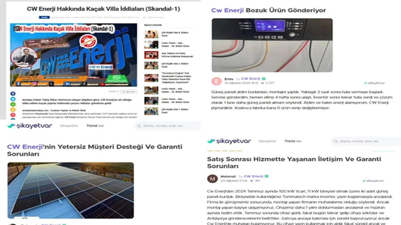 Antalya’da faaliyet gösteren hakkında kaçak villa iddiaları da bir çok kez haber olan CW Enerji firması, müşterilerini de isyan ettiriyor. CW Enerji güneş panelli sistemlerindeki İnvertör hataları yaşanırken, firmanın ilgisizliği de büyük tepkilere yol açıyor.