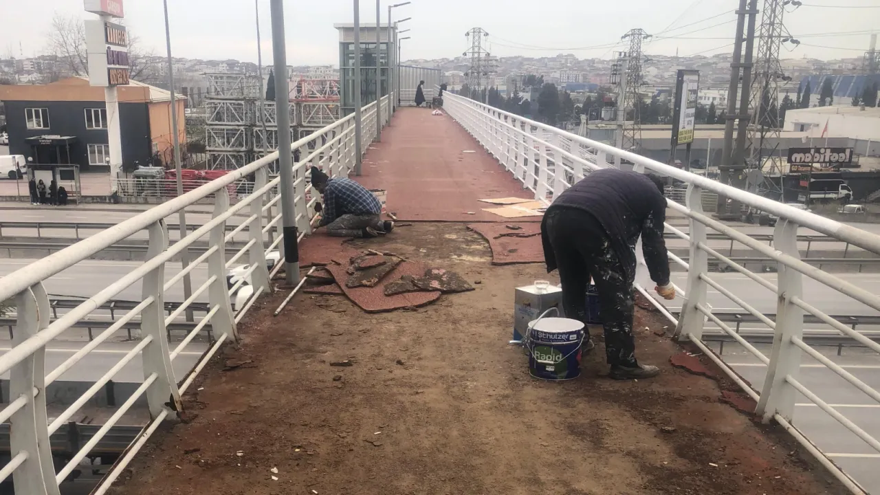 Trafik akışını etkilemeden sürdürülen çalışmalar doğrultusunda üst geçitte merdiven basamaklarının ve korkulukların kaynak, zımpara, boya tadilatı işlemleri tamamlanırken, zemin kaplama çalışmaları ise devam ediyor. Kış şartları ve yağışlar nedeniyle kısa süreliğine ara verilen çalışmalar, havaların elverişli hale gelmesiyle peyder pey sürüyor.