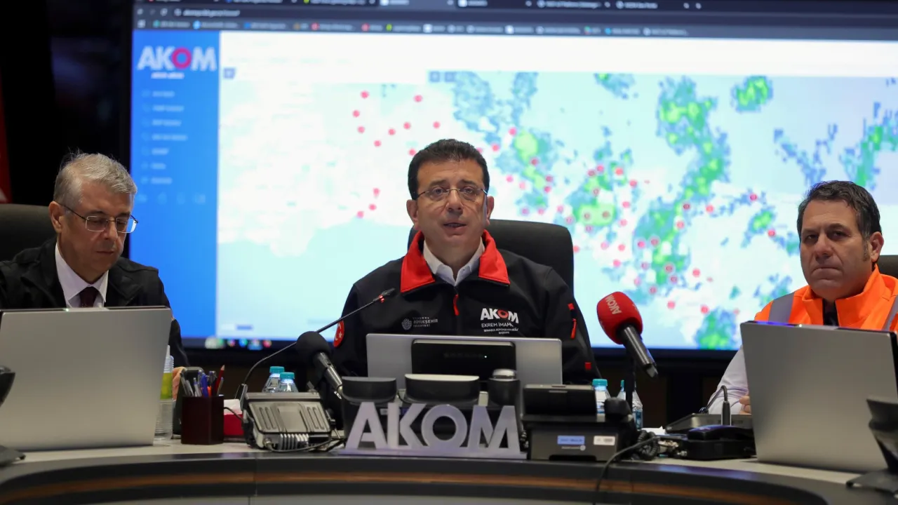 Türkiye Belediyeler Birliği ve İstanbul Büyükşehir Belediye Başkanı Ekrem İmamoğlu, kentte yaşanan olumsuz hava koşullarına karşı yapılan mücadeleye AKOM’da tanıklık etti.İSTANBUL (İGFA) - İstanbul’da yaşanan olumsuz hava koşullarına karşı yapılan mücadeleye Afet Koordinasyon Merkezi’nde (AKOM) tanıklık eden İstanbul Büyükşehir Belediye Başkanı Ekrem İmamoğlu, kurmaylarından ve uzman isimlerden bilgi aldı.