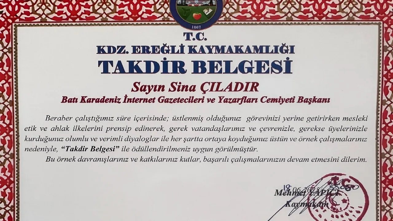 Kdz. Ereğli Kaymakamı Mehmet Yapıcı, Batı Karadeniz İnternet Gazetecileri ve Yazarları Cemiyeti Başkanı Sina Çıladır’ı mesleki etik ve örnek çalışmaları nedeniyle takdir belgesiyle onurlandırdı.ZONGULDAK (İGFA) - Karadeniz Ereğli Kaymakamı Mehmet Yapıcı, Batı Karadeniz İnternet Gazetecileri ve Yazarları Cemiyeti (BATİYAC) Başkanı Sina Çıladır’a takdir belgesi verdi. Çıladır, cemiyet yönetimi adına mesleki etik, ahlak ilkelerine bağlılığı ve örnek çalışmaları nedeniyle ödüllendirildi.