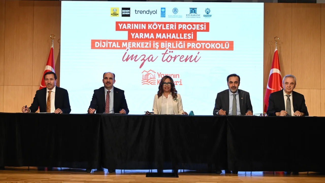 Konya’da, Birleşmiş Milletler Kalkınma Programı (UNDP), Konya Büyükşehir Belediyesi, Karatay Belediyesi, KTO Karatay Üniversitesi ve Trendyol iş birliğiyle hayata geçirilen “Yarının Köyleri Projesi” için Yarma Mahallesi Dijital Merkezi protokolü imzalandı. Proje, kırsal kalkınmayı dijitalleşmeyle buluşturarak köyden kente göçü durdurmayı hedefliyor.KONYA (İGFA) - Konya, tarımın başkenti olmanın ötesine geçerek dijital dönüşümle kırsal kalkınmada öncü bir adım atıyor.